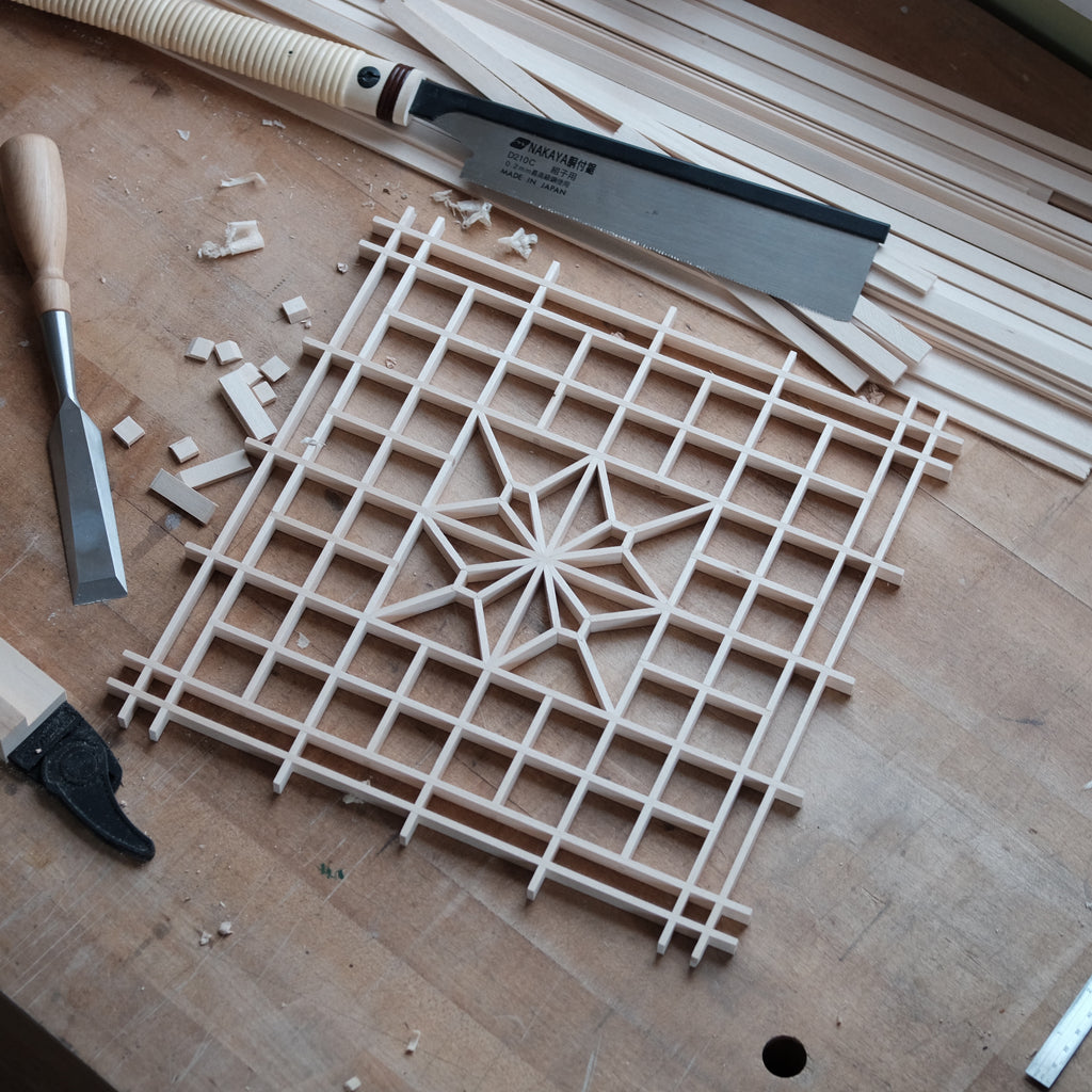 The pattern at the center of this panel is one I created by mirroring a section of a larger pattern called kiri. It's featured in my book, The Art of Kumiko, where I give detailed instructions for making it. This kit includes the frame strips, with notches, and plenty of strips without notches to make the dogwood blossom and all the hemp leaves surrounding it. It does not include material for making the painted frame, fabric, tools, guide blocks, or the joy in my heart when I make this panel.