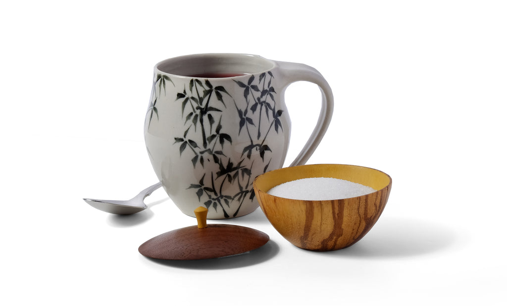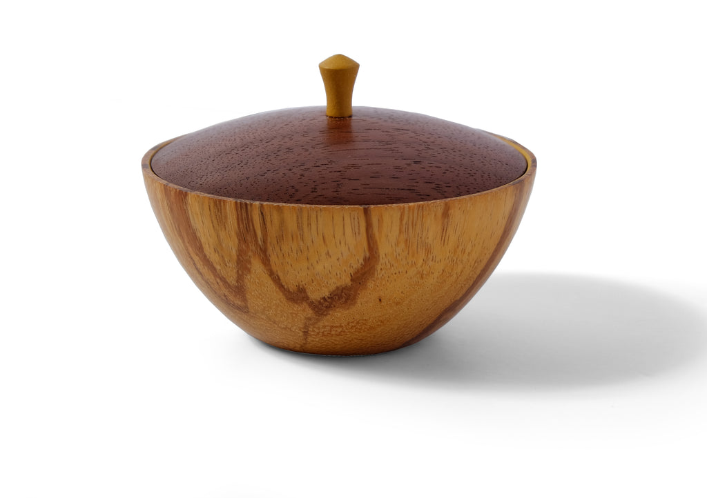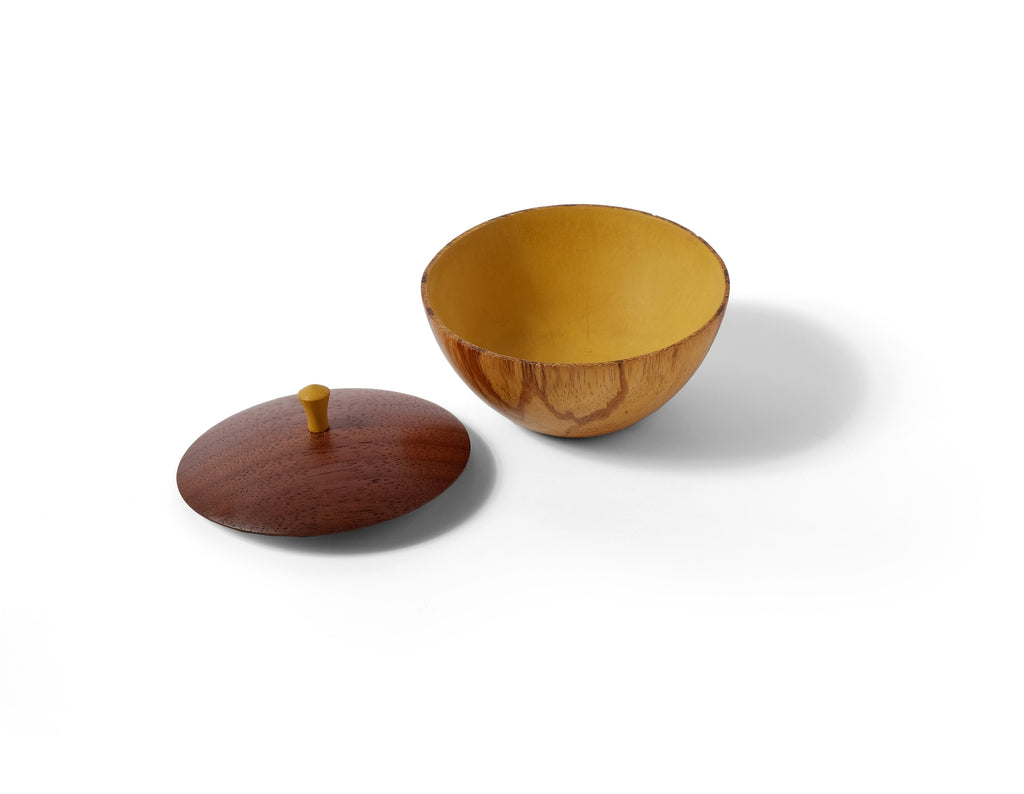 Turned lidded box. Monkeypod, walnut, apple. Interior painted with marigold yellow milk paint.