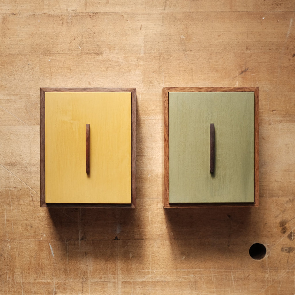Solid wood body with painted lid and cocobolo pull. Bottom is lined with fabric.