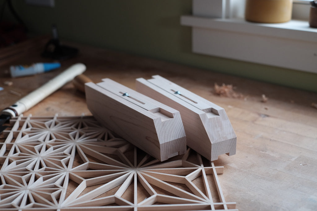 The best way to cut the angles you need to make kumiko patterns is with a chisel and a guide block. The chisel’s back lays flat on the guide’s reference surface when you make the final pass over the infill piece, ensuring that the bevel is at the correct angle. Each guide surface has its own independent stop, so you can quickly make dozens of identical pattern pieces rather than attempting to fit them individually. The stops are designed so that you don't need to reset them for one surface to use another, to minimize how often you must move the locking screw, and accommodate a wide range of part sizes. Made from soft maple.