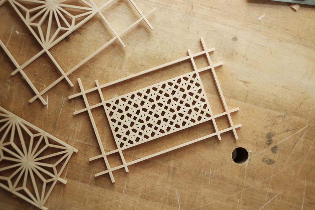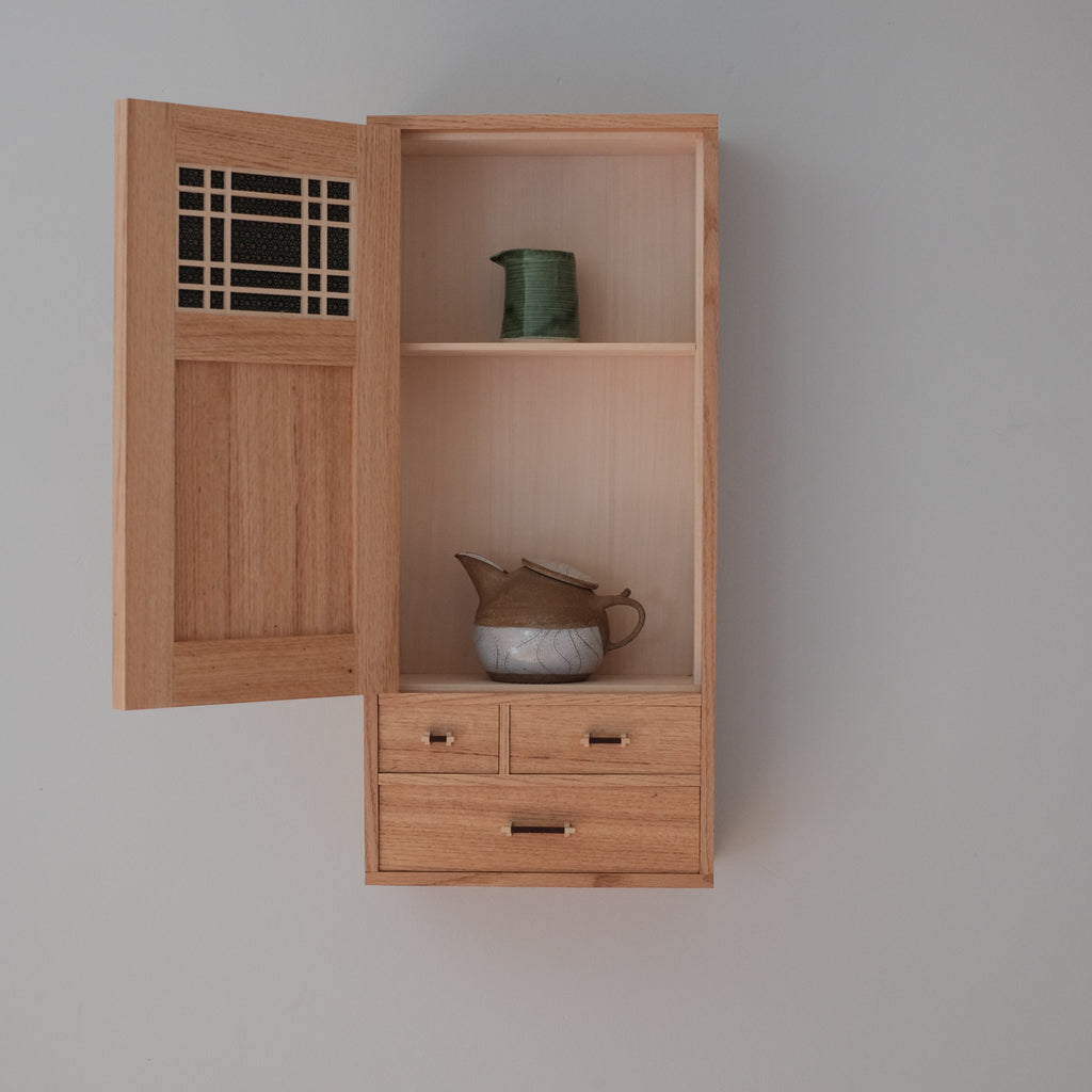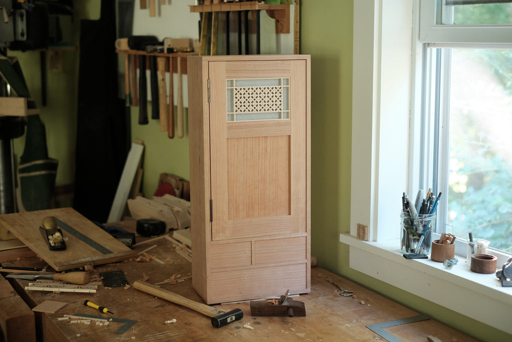 This cabinet is one of the most popular pieces of furniture that I've made. It's a delicate cabinet: 5 in. deep by 10 in. wide by 22 in. tall. I've made it in both Northern red oak and cherry, and with different kumiko panels in the door. I've also made it slightly deeper, at 5 1/2 in. I think a 6 in. deep cabinet would be fine, too.