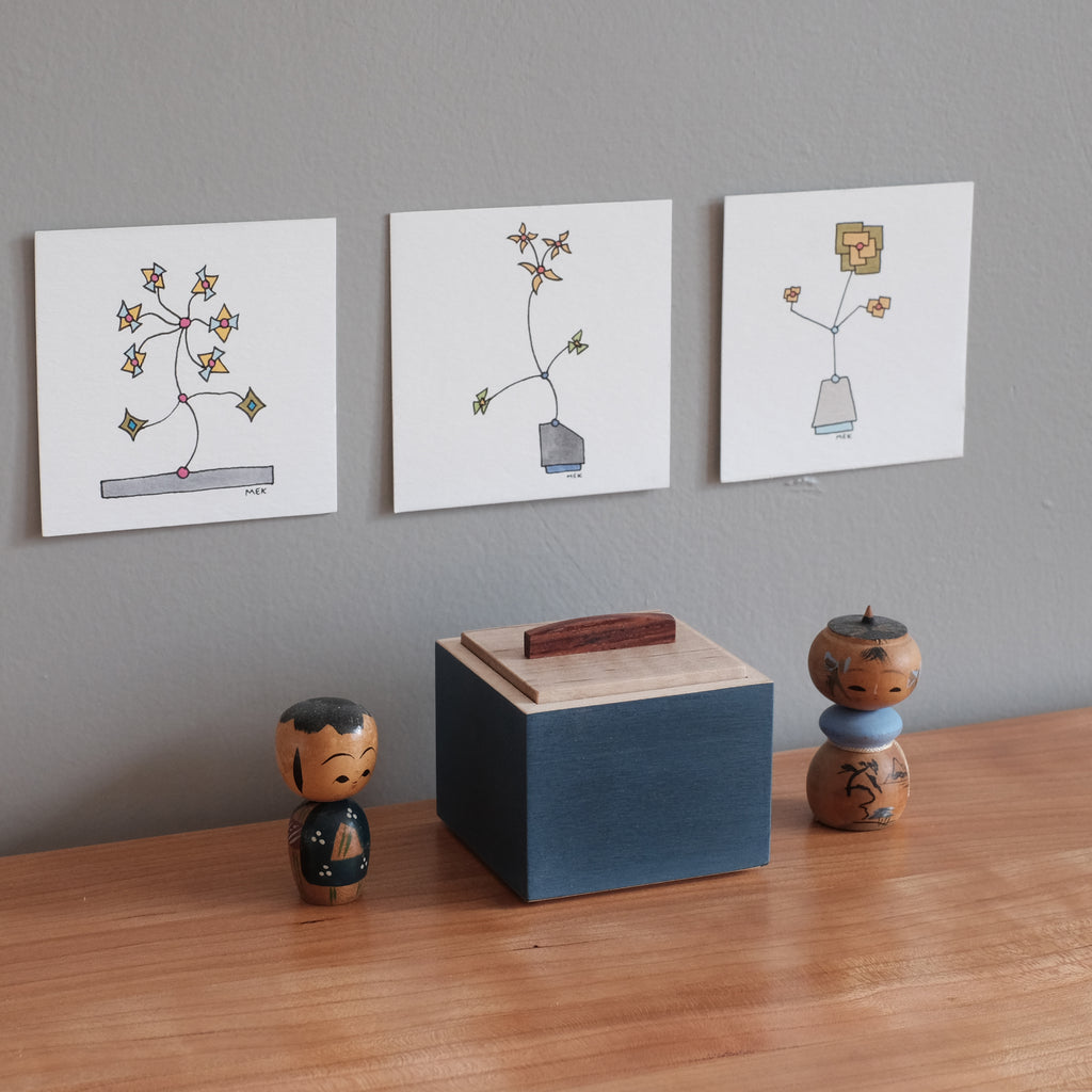 This box began life as a salt box for my kitchen, but I soon realized it's a good size to store rings and other small pieces of jewelry, keepsakes, and the like. It's 2 1/4 in. square and 1 7/16 in. deep inside. The box body is made from basswood. The interior is painted a light shade of blue, and the exterior comes in four colors: pale green, oyster white, marigold yellow, and deep blue. Scroll through all of the photos to see images of the colors. I pair the marigold yellow and oyster white boxes with a walnut lid, the deep blue with curly maple, and the pale green with spruce. The pull is made from cocobolo and will darken with age and use. The box does not come with a ring cushion, but I am happy to make one for you (adds $25 to price). I'll pick the fabric, but I promise it will look fantastic.