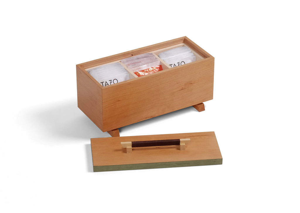 The perfect companion for afternoon tea, this elegant box has three interior compartments for your favorite teas. It sit elegantly atop feet inspired by the architecture of Japanese temples. The pull echoes the feet in shape and construction. Wrapped in thread, it's graceful but also provides a sure grip. Cherry accented with green milk paint, basswood, and brown thread. Price does not include shipping.