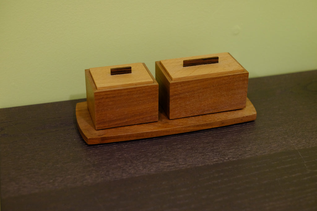 Two walnut boxes on a tray, white oak lids, zircote pulls. Fabric inside.